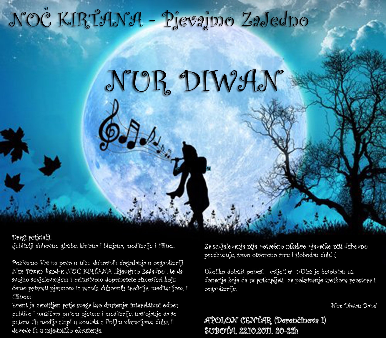 Nur Diwan Band – NOĆ KIRTANA – „Pjevajmo ZaJedno“– SUBOTA, 22.10.2011. APOLON CENTAR (Derenčinova 1), 20-22h