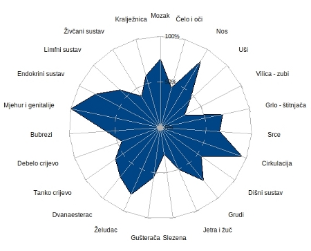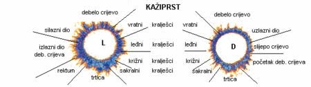 Na dijagramu ispod vidi se da je vrh svakog prsta povezan s određenim dijelom tijela. Konkretno, vrhovi kažiprsta povezani su s kralježnicom i debelim crijevom. Ostali prsti povezani su s drugim dijelovima tijela. Gledajući oblik, gustoću, svjetlinu i ostale karakteristike korone prstiju dosta pouzdano i precizno može se odrediti energetsko, a samim tim i fizičko stanje pojedinih organa, odnosno, psihofizičko stanje čovjeka.