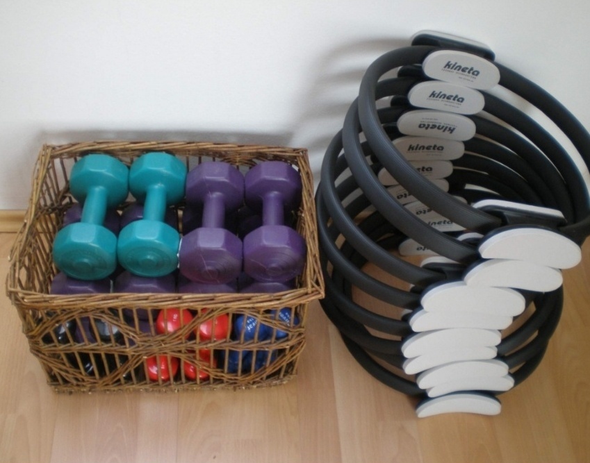 Magic circles (pilates obručevi), štapovi, male pilates lopte, elastične trake dugačke i okrugle, bućice, čičak utezi za noge/ruke, loptice za refleksologiju stopala…